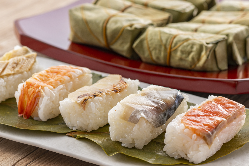 柿の葉寿司は、酢飯に塩で締めた鯖や鮭をのせて、柿の葉で包んだ押し寿司です。古くは江戸時代から、吉野川沿いの五條・吉野地区でお祭りやハレの日のごちそうとして食べられていたとか。