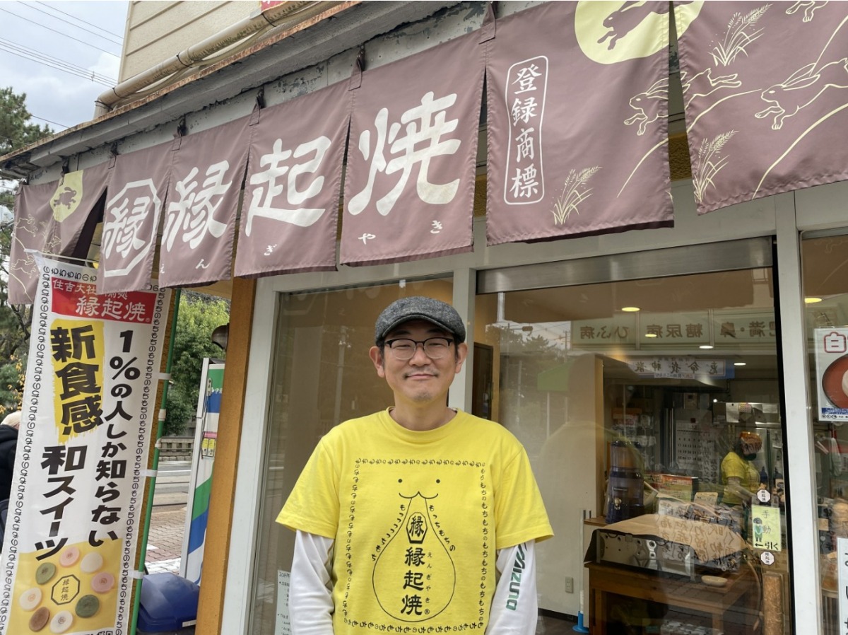⼤阪・住吉⼤社の真正⾯に位置する「縁起焼 住吉⼤社店」。⼭⼝県下関市で⽣まれた「縁起焼」の名前の由来は、「⼋⽅位からのすべての良いご縁を引き寄せることができる」だそうです。店主の上尾さんは、⼭⼝を旅⾏中に「縁起焼」と出会い、モッチモチの⽣地と素朴な餡の⽢みに惚れ込んで⼤阪での出店を決意。現在、参拝客や観光客から⼤阪の新名物として⼈気を博しています。今回のイベント報酬は「縁起焼 ⼤阪住吉店」とのコラボで誕⽣した「うさぎの焼印」が⼊ったスペシャルバージョンの縁起焼です。