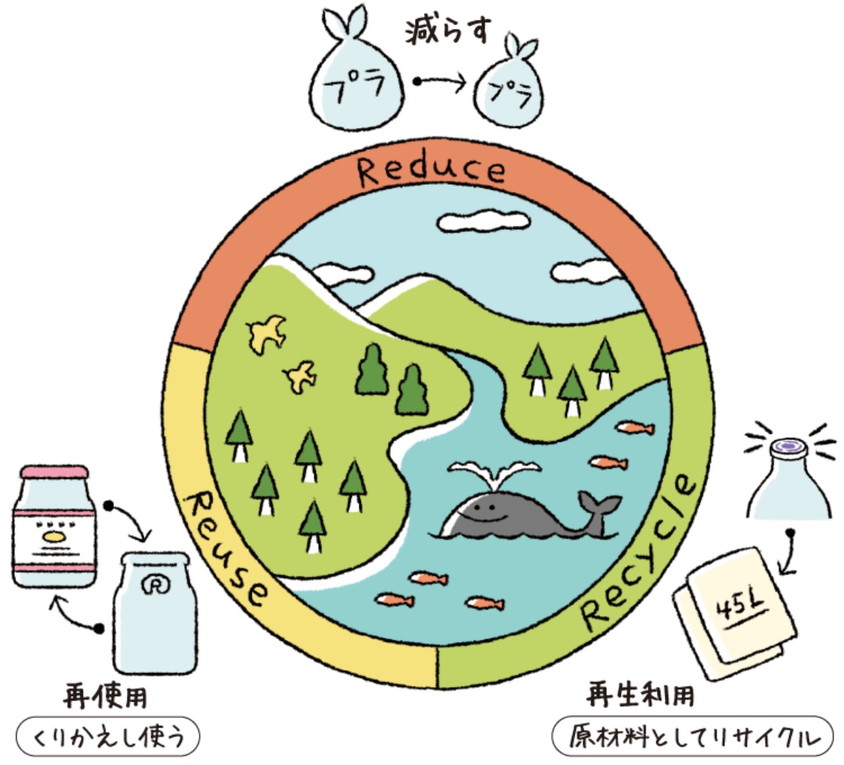 日本のプラスチックごみの40%以上が容器包装といわれているため、それらに使うプラスチックを減らすことが大切です。