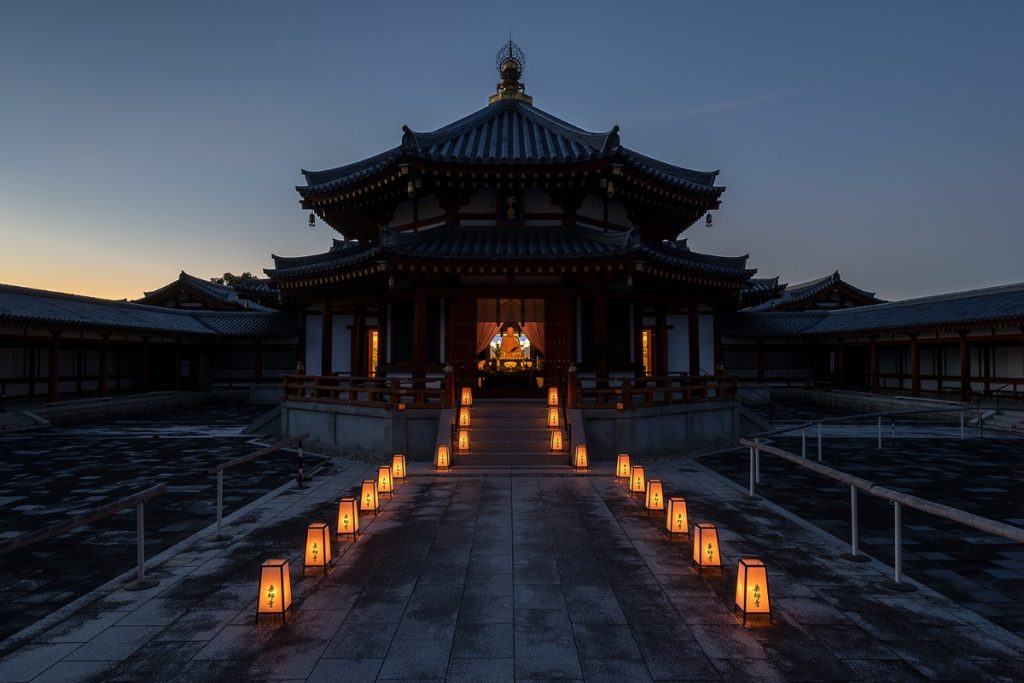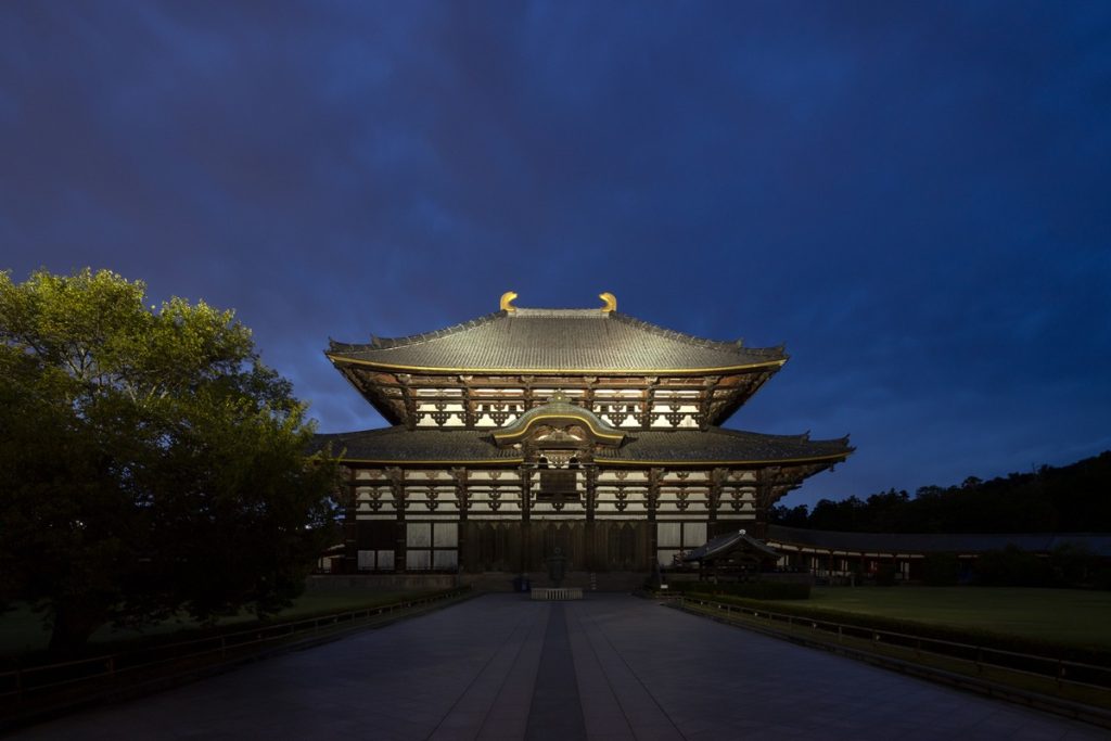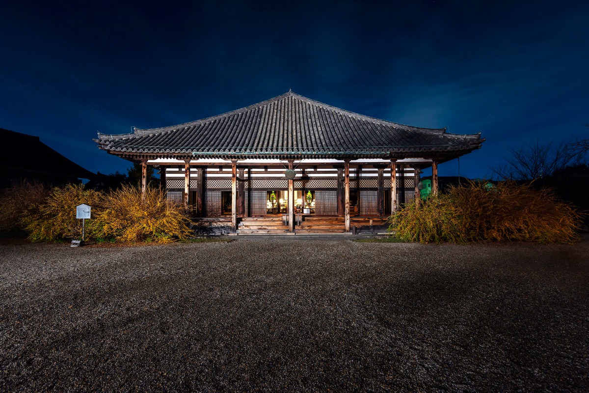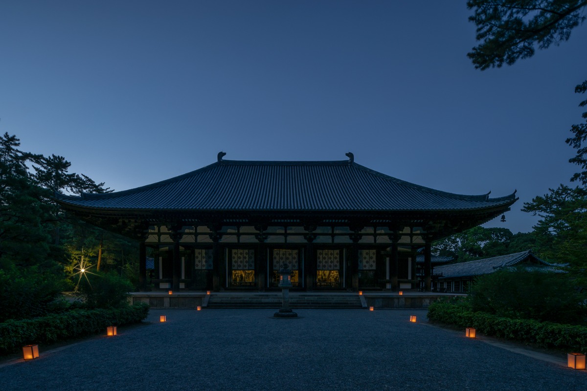 奈良時代の創建当初の規模や仕様で復元された、お堂の夜の姿も壮観!