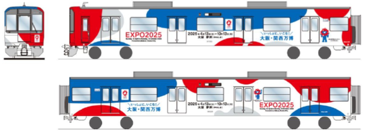 ラッピングトレインには、大阪・関西万博のテーマである「いのち輝く未来社会のデザイン」を力強く表現するロゴマークや、公式キャラクター「ミャクミャク」をデザインしている。
