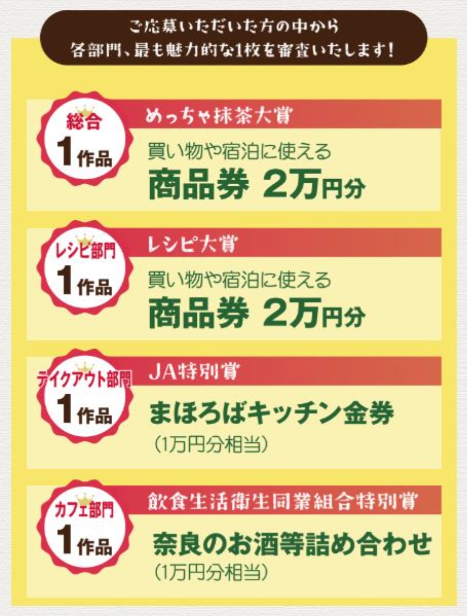 ・レシピ部門:撮影した画像もしくは動画に、レシピ内容とこだわりポイントひとことを添え、必ず「#めっちゃ抹茶奈良」のハッシュタグをつけてインスタグラムへ投稿する。