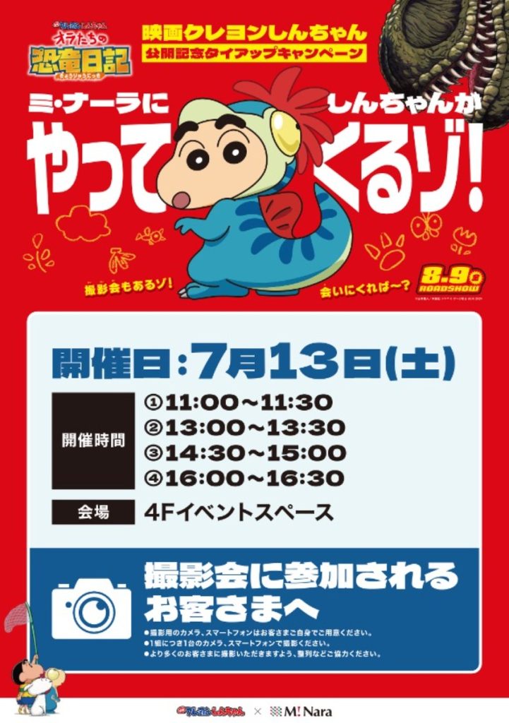 奈良市の「ミ・ナーラ」では、2024年8月9日公開の映画『クレヨンしんちゃん オラたちの恐竜日記』とのスペシャルコラボイベントを開催中。