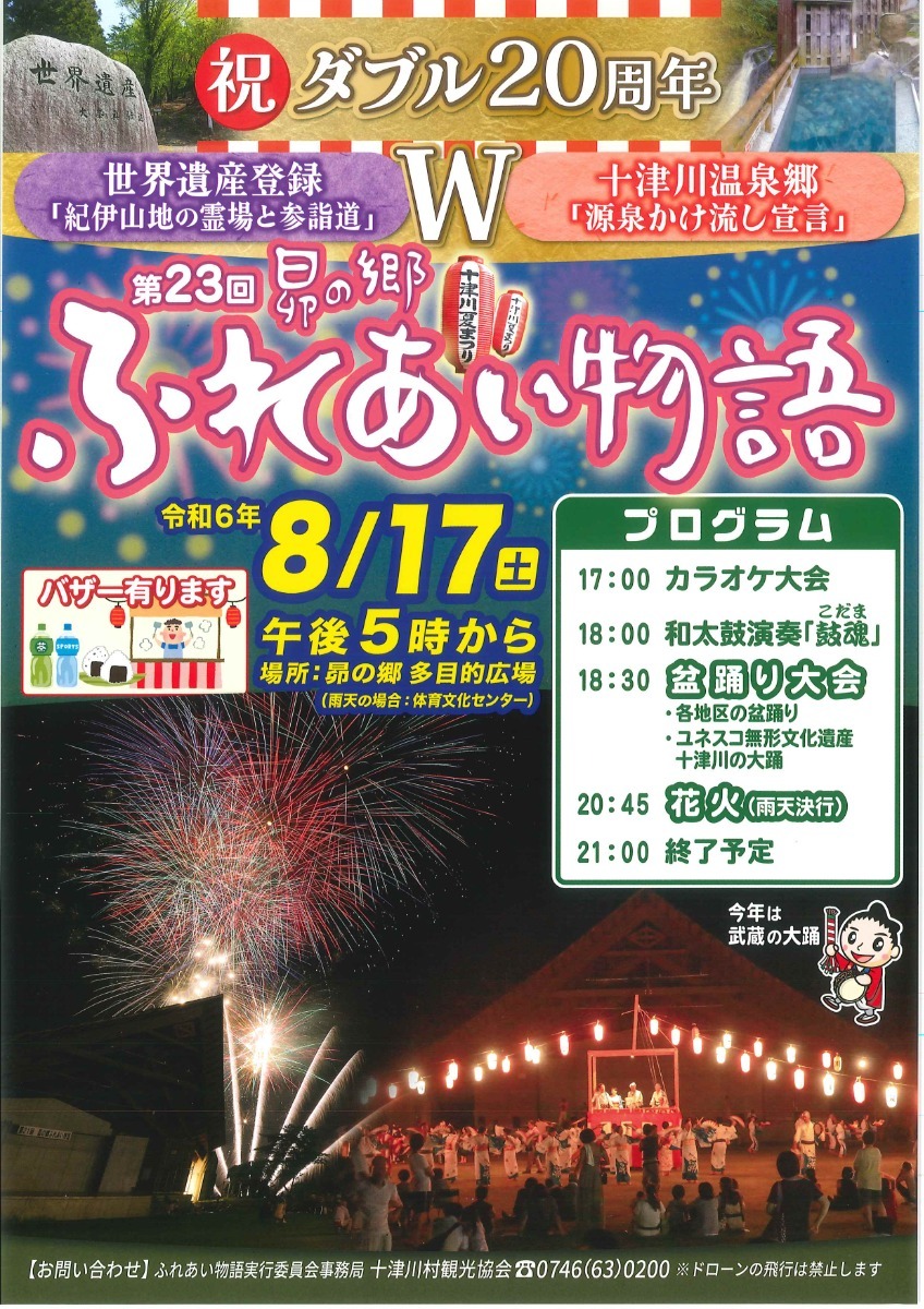 今年は、十津川温泉郷「源泉かけ流し宣言」と世界遺産「紀伊山地の霊場と参詣道」のダブル20周年を記念して開催!
