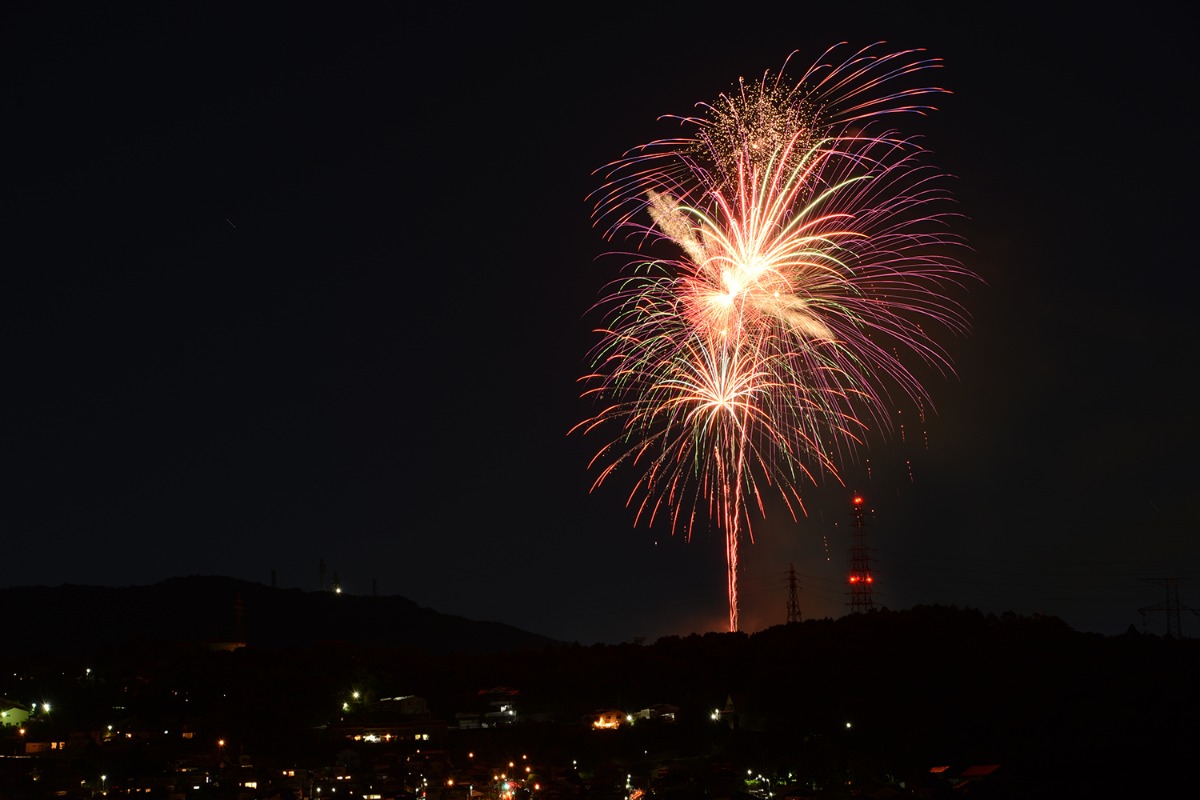 夜には市内3か所で花火が打ち上げられ、生駒の夜空が鮮やかに彩られる。