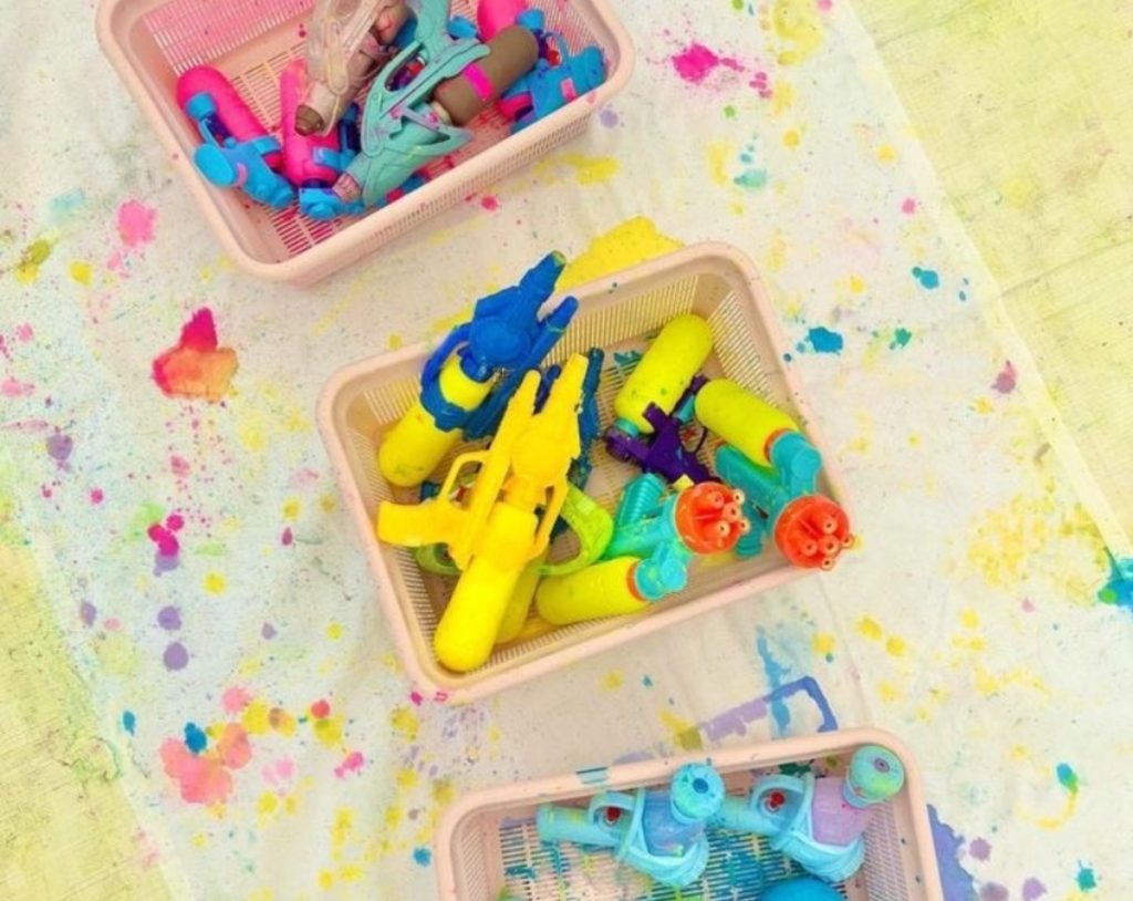 カラー⽔鉄砲でTシャツを染めてオリジナルTシャツを作るワークショップや、⼿形⾜形アートなどのアート体験、アクセサリー作り、プチ縁⽇ブースでのスーパーボールすくいなど、室内で遊べるコンテンツが盛りだくさん!