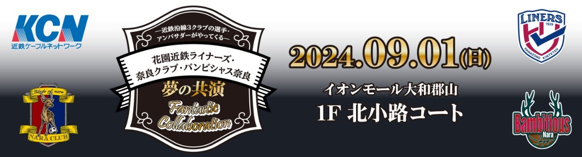 大和郡山市にある『イオンモール大和郡山(北小路コート)』で、近鉄奈良線沿線3クラブによるコラボイベント「花園近鉄ライナーズ・奈良クラブ・バンビシャス奈良 夢の共演-Fantastic Collaboration-」が開催される。
