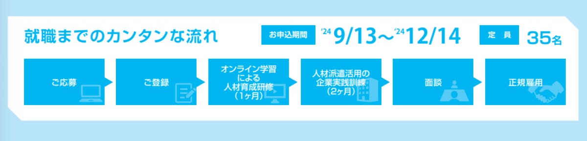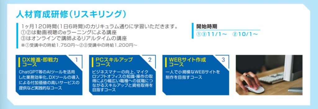 ※1ヶ月間オンライン学習による人材育成研修+2ヶ月間の人材派遣を活用した企業実践訓練の、計3ヶ月間の雇用予定型訓練です。