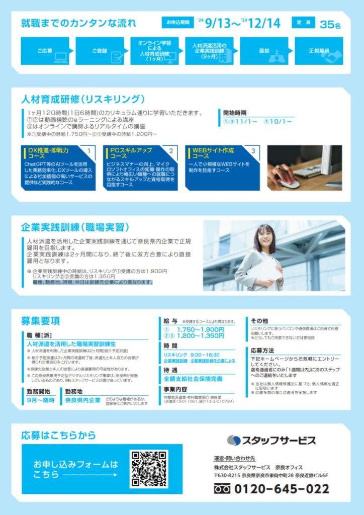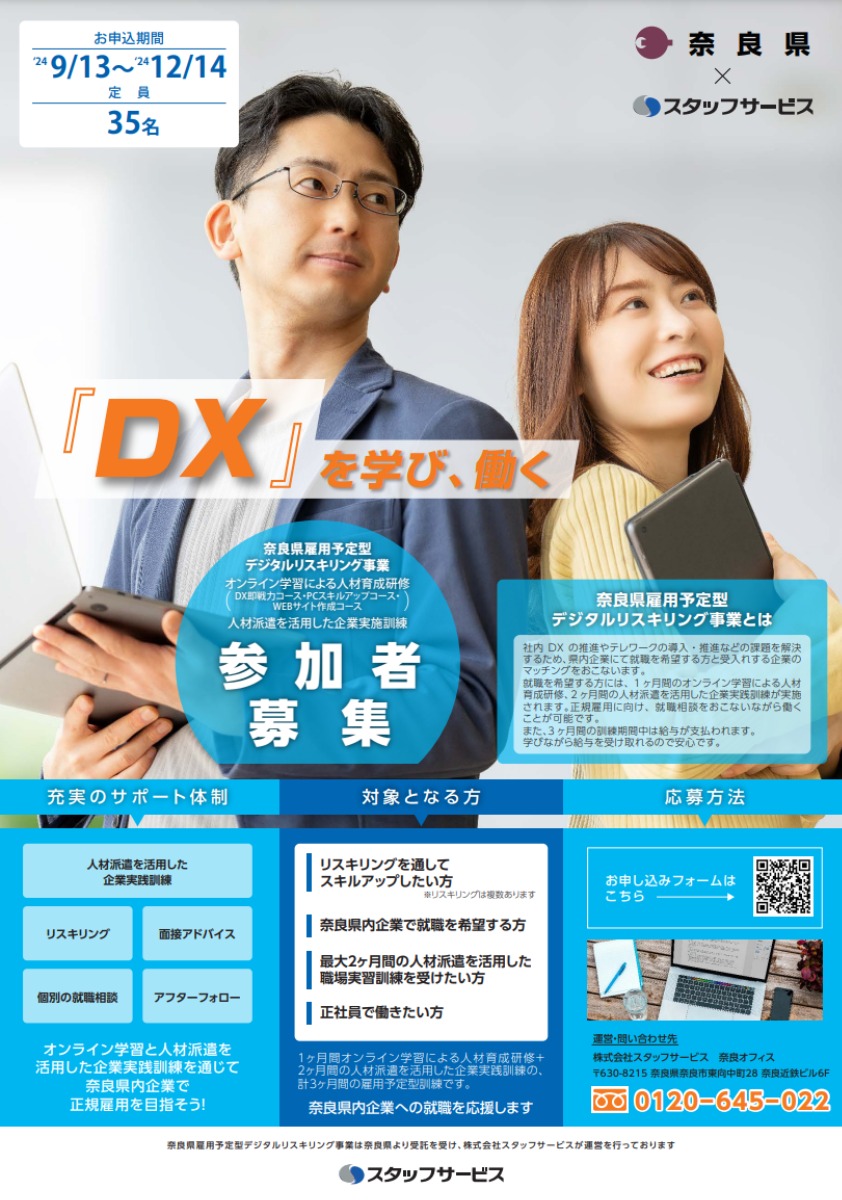 オンライン学習と人材派遣を活用した企業実践訓練を通じて奈良県内企業で正規雇用をめざそう!