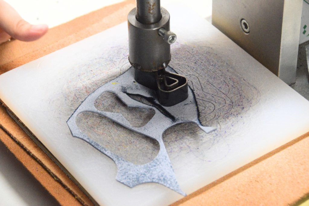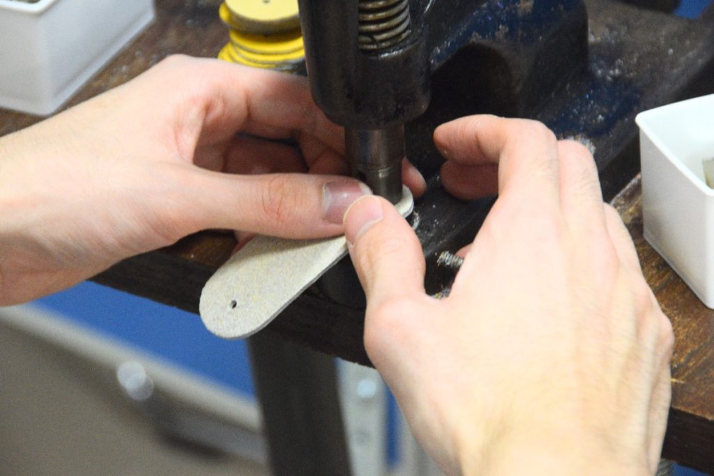 皮を裁断し、ボタンを付ける作業。