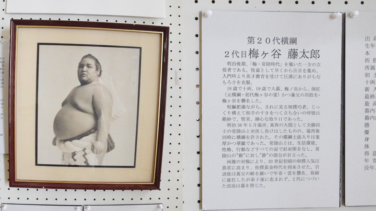中には第20代横綱の梅ヶ谷のパネルや平成20年や20年前の番付表など約130点の作品が展示されている。