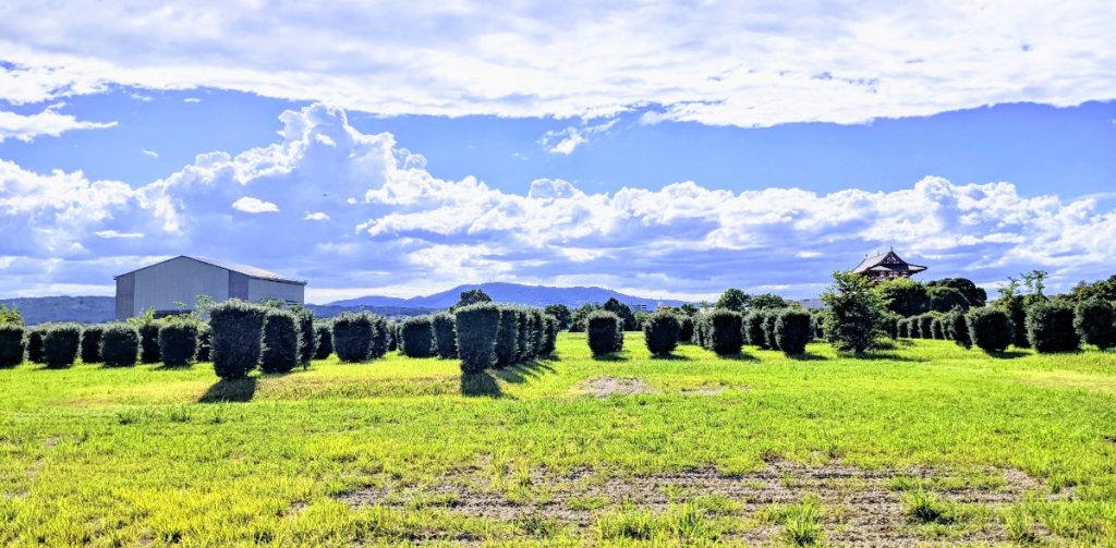 平城宮内裏(西から)。第一次大極殿と復元中の東楼も見える。柱の場所を示す緑柱は本ツゲで、奈良文化財研究所ゆるキャラのツゲじいのモデル。 撮影:難波美緒