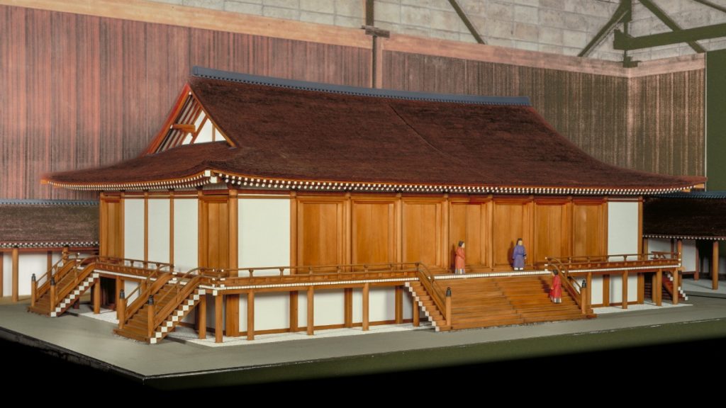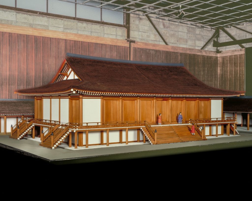 平城宮内裏正殿模型の全景。建築史の復元研究により、このような建物が立っていたと推定されている。提供:奈良文化財研究所