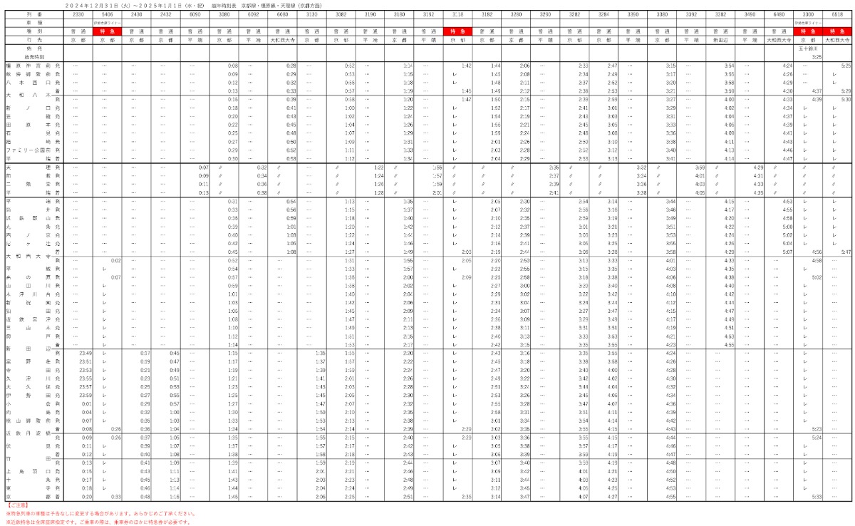奈良線、京都線など主要路線の終夜運転情報。