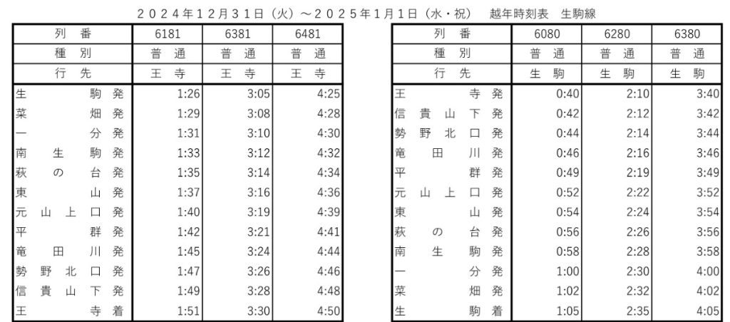 生駒駅 ⇔ 王寺駅間 (終夜 約80分~100分間隔で運転)