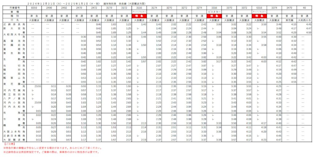 近鉄奈良駅 ⇒ 大阪難波駅行き(1時、3時台)