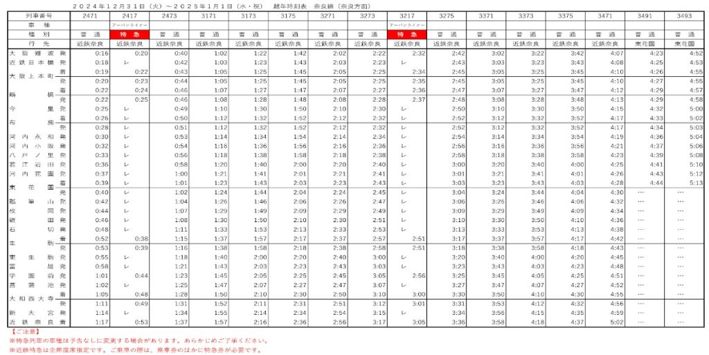 大阪難波駅 ⇒ 近鉄奈良駅行き(0時、2時台)