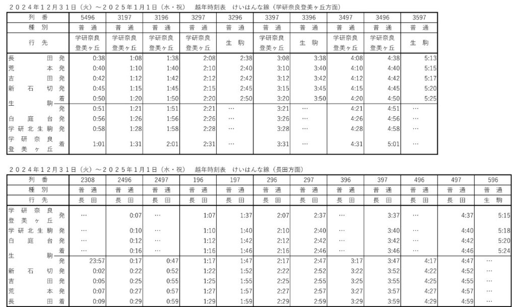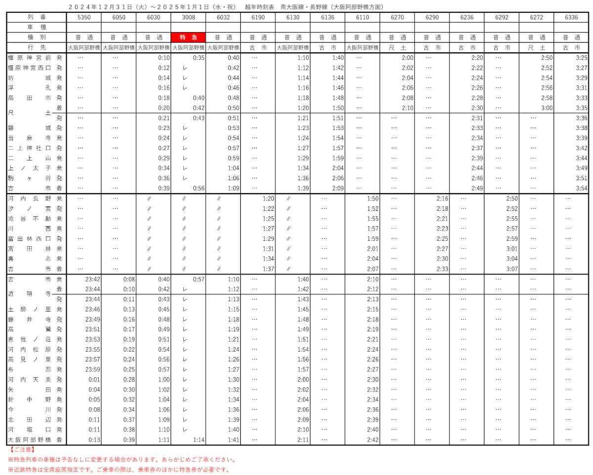 大阪阿部野橋・古市駅 ⇔ 河内長野駅間 (古市駅発2時28分発まで 約30分間隔で運転) (河内長野駅発2時50分発まで約30分間隔で運転)