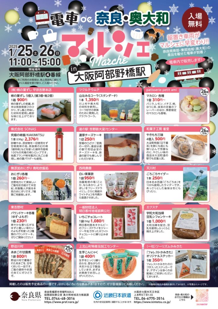 2025年1月25日(土)と26日(日)の2日間、近鉄大阪阿部野橋駅で「電車de奈良・奥大和マルシェin大阪阿部野橋駅」を開催される。