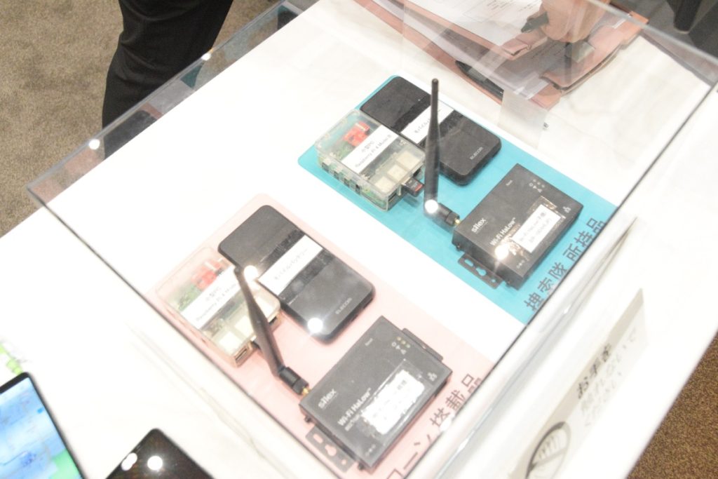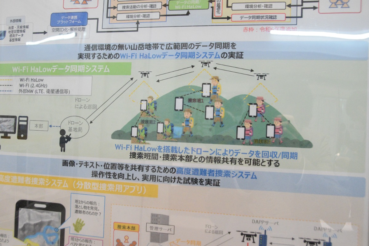 これを使うと、いくつもの捜索隊が山中でも情報共有ができ、ドローンが各捜索隊の情報をキャッチし、スムーズに遭難者を探すことができる。