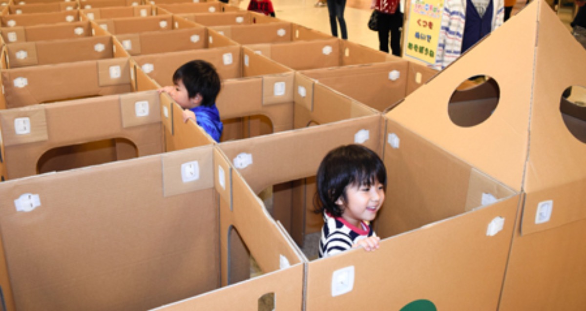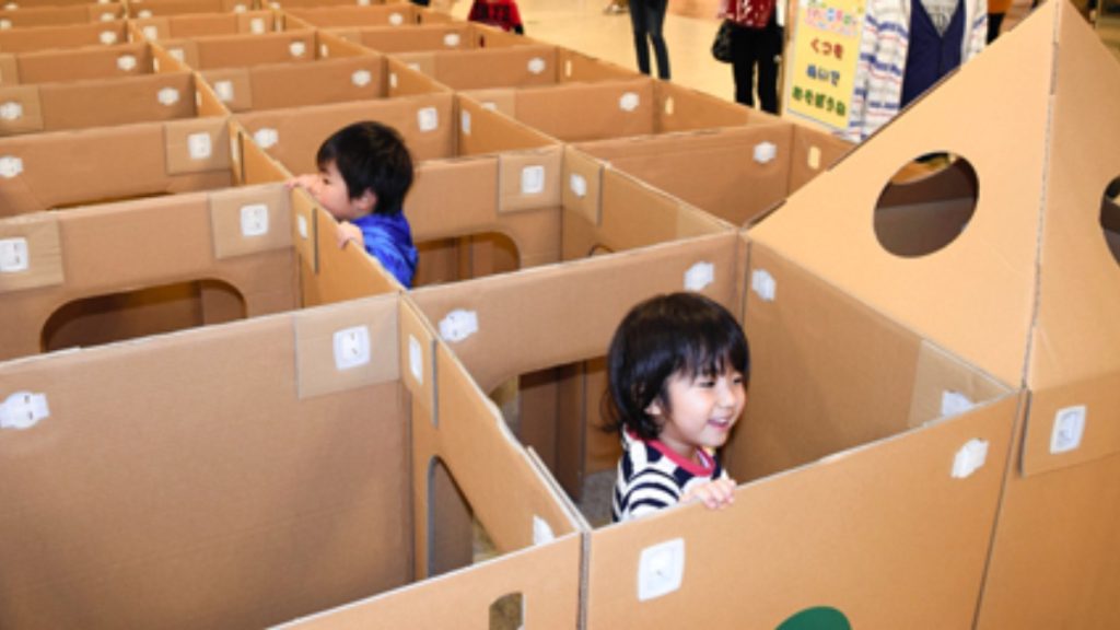 万葉文化館の企画展示室に段ボールでできた巨大めいろが登場!