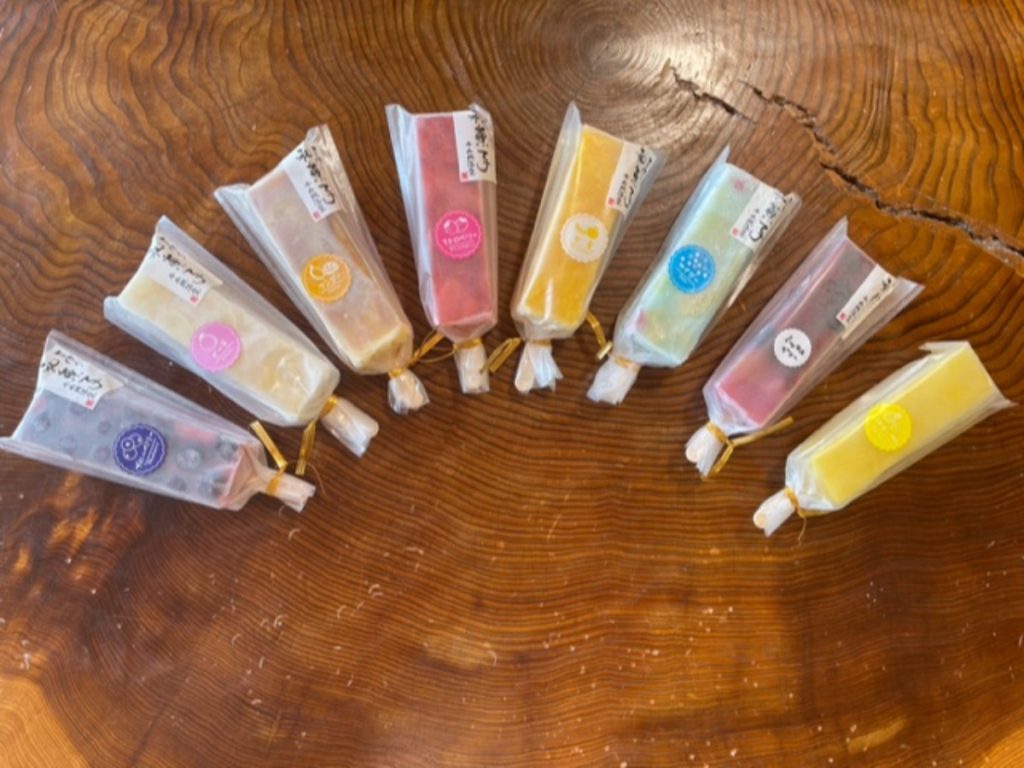 種類は苺、ブルーベリー、パイン、甘夏、ミックスベリー、ミックスフルーツ、マンゴーなど並ぶ。
