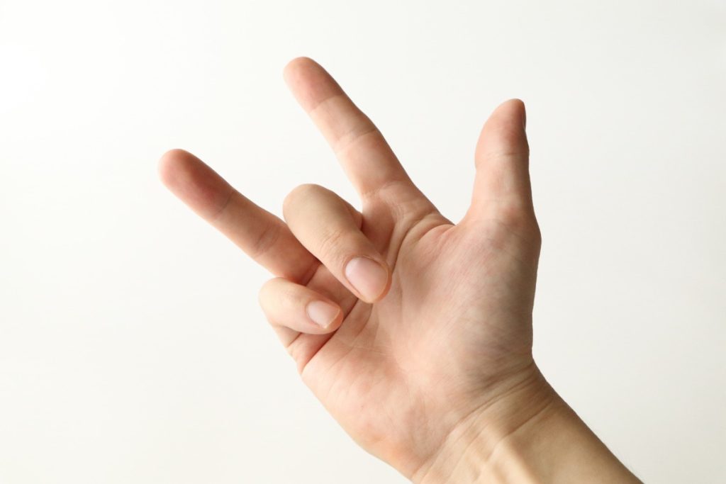 中指と小指を曲げる「グワシ」の手ポーズ。わたしはできません…。