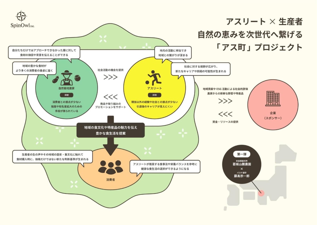 「アス町」プロジェクトは、株式会社Spin Owlがバスケ・サッカー・バレー分野でのサポートアスリートたちと共に地域の生産者と手を組み、「いただき燈」というブランドを通して、豊かな食文化を次世代に繋いでいく取り組み。