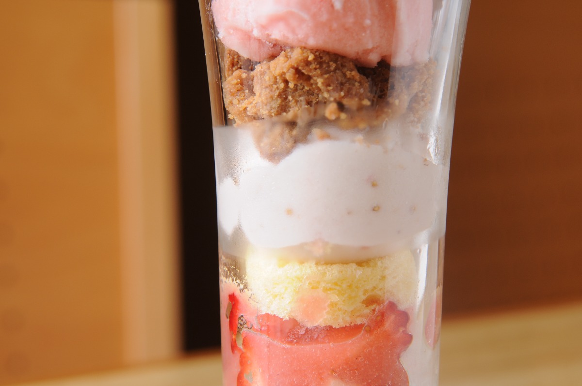 カリカリ香ばしいブリュレからスタートし、バニラジェラートやカスタードクリーム、フレッシュいちご、クランブル、いちごソルベ、スポンジ、いちごミルクのソルベと9層になっている贅沢パフェ!