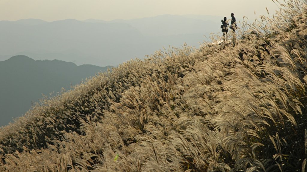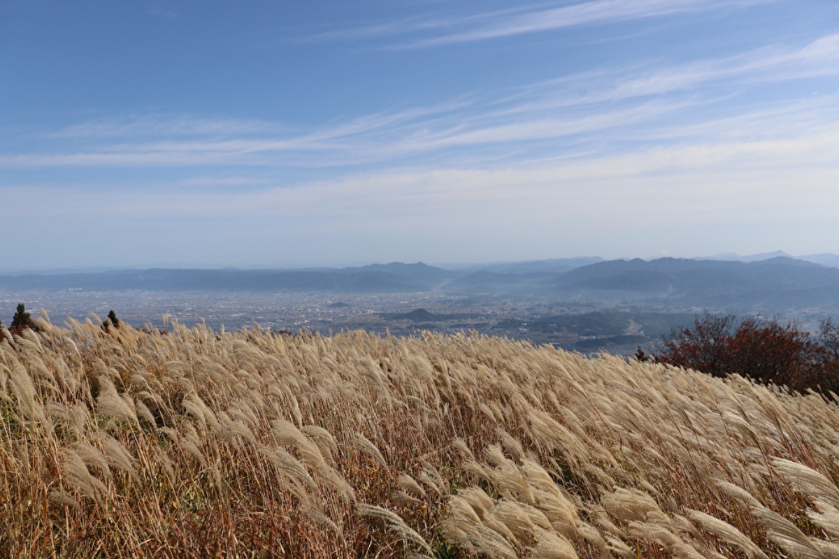 下界で秋を感じる季節になると、葛城山一帯は黄金色に輝くススキの大海原に。標高959mの山頂で秋風にススキの穂先がなびくさまはとても爽快!
