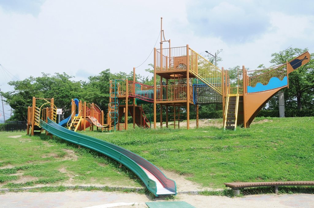 葛城川一帯に、水と緑の空間として整備された心地よい公園。船の形をしたアスレチックは、すべり台やスライダー、くぐり抜けるネットやボルダリングホールドがついた登り坂など、おもいきり体を動かして楽しめる遊具が盛りだくさん。柵で囲われた砂場や芝生広場もあるので、ちびっ子も安心して遊べる。また、気持ちよさ倍増の噴水やミストは子どもたちに大人気。大人は木陰や屋根付きのベンチでゆっくり過ごせるのが嬉しい。