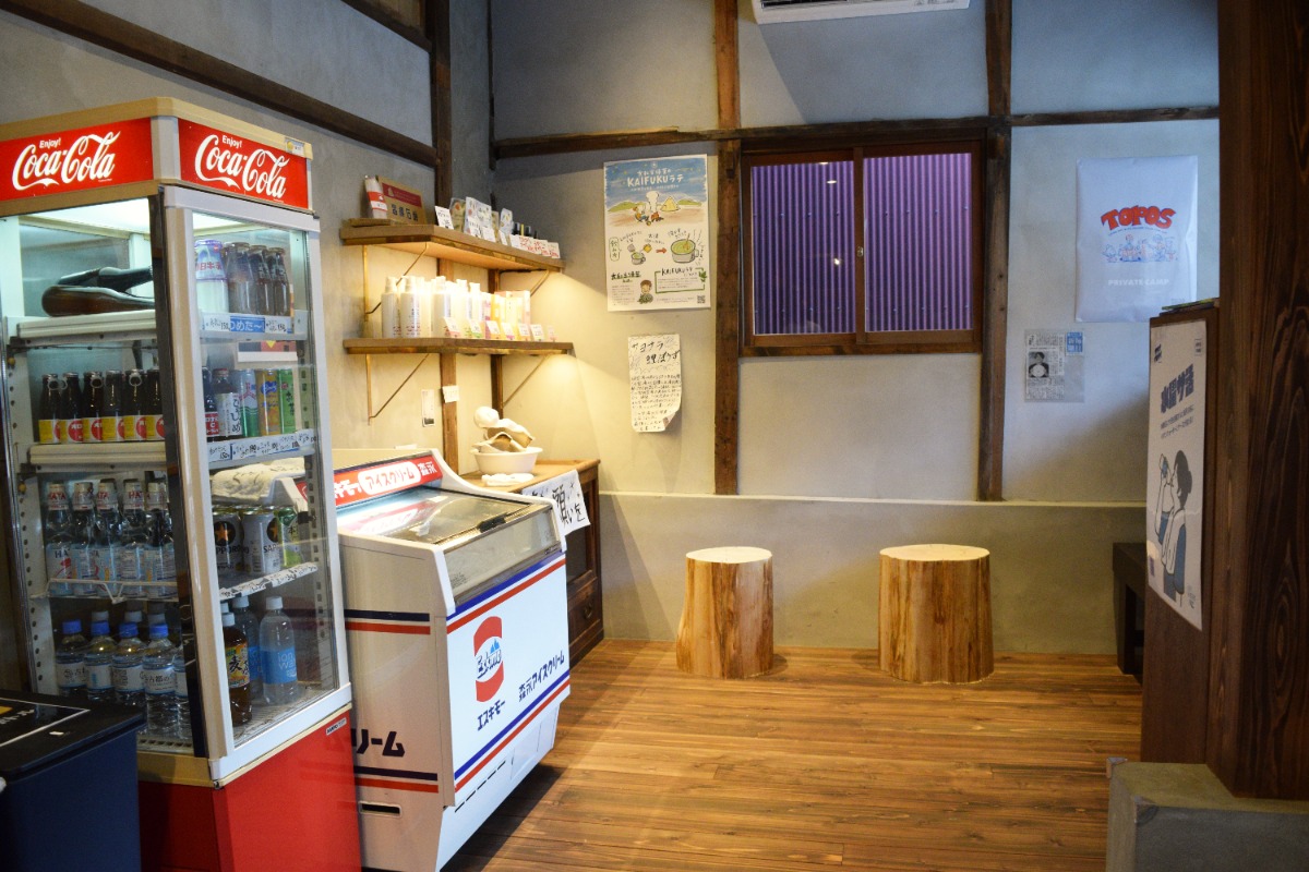 ジュースやアイス、石鹸などの物販コーナーであり、団らんを楽しめるスペースとなっている。