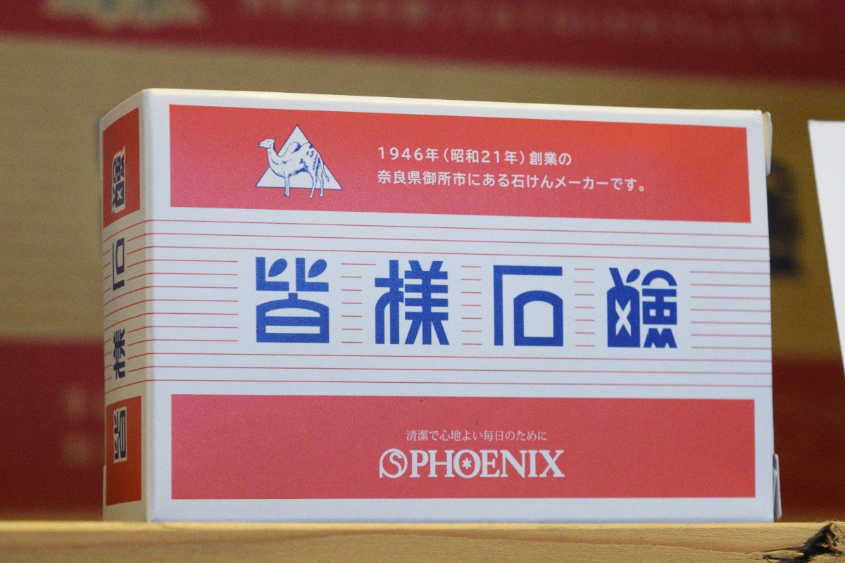 創業75年目の御所市の老舗石鹸メーカー『株式会社フェニックス』の『皆様石鹸』。お風呂好きに愛され続けている石鹸だ。