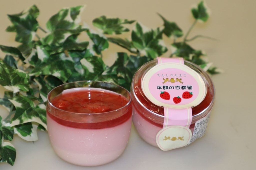 平群町の古都華と、吉野のたまごがコラボレーションしたプリンは、いちご好きはマストチェック。