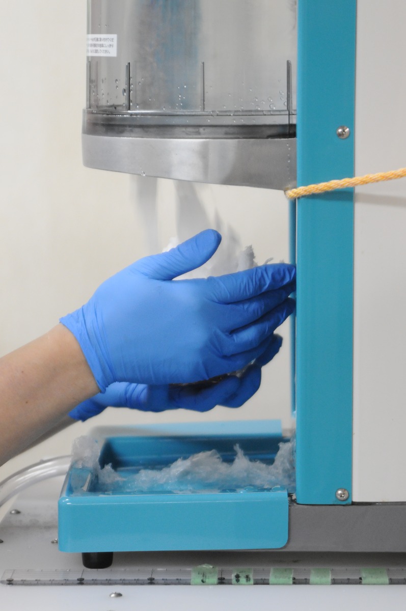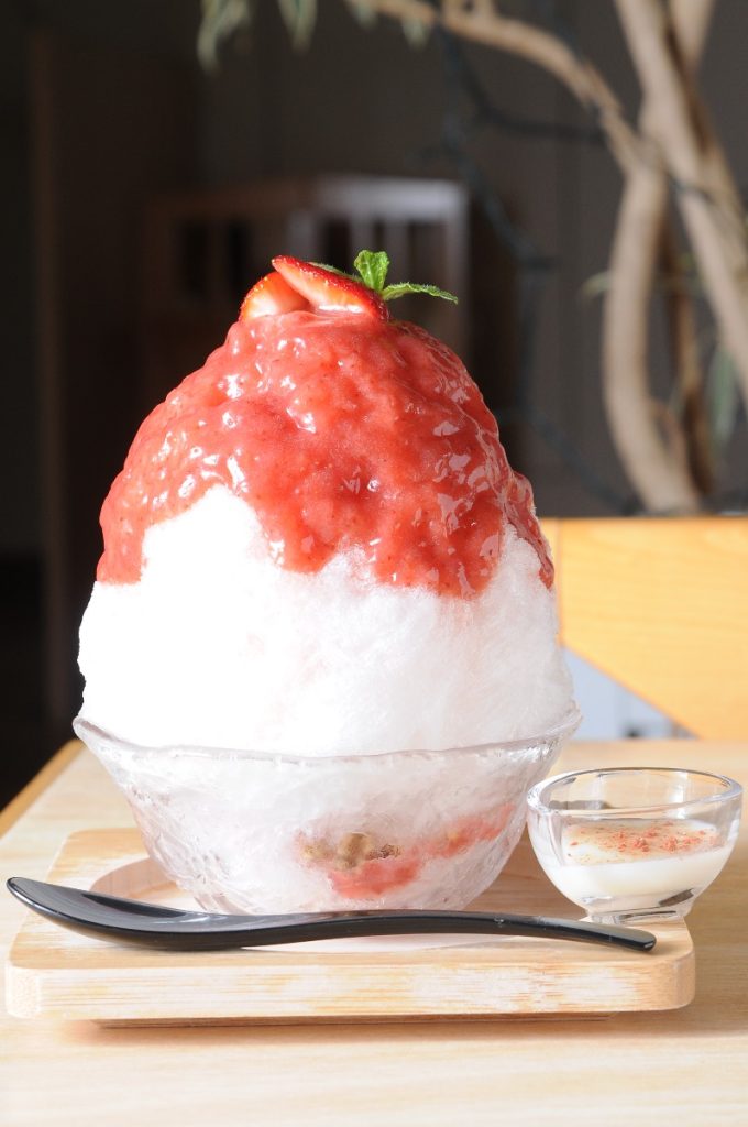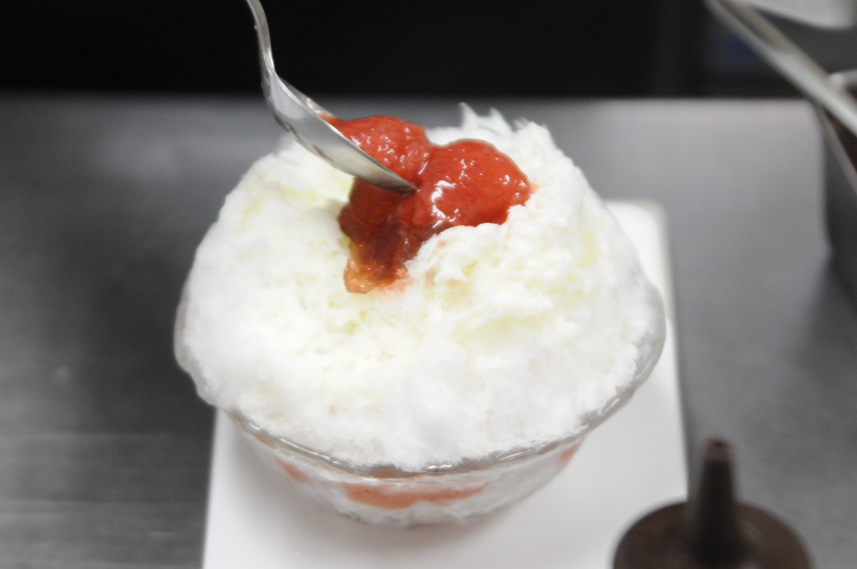 丁寧に削った氷に、ミルクシロップや特製いちごソースをかけては、さらに氷を重ねる。