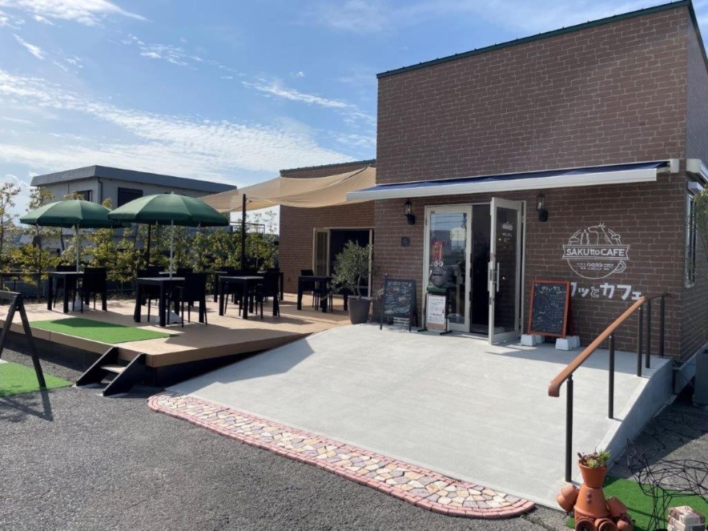 JR法隆寺駅から南へ徒歩約15分、法隆寺ICからは車で約1分。広い駐車場と気持ちの良さそうなテラス、レンガ状のスタイリッシュな建物は『サクッとカフェ』。