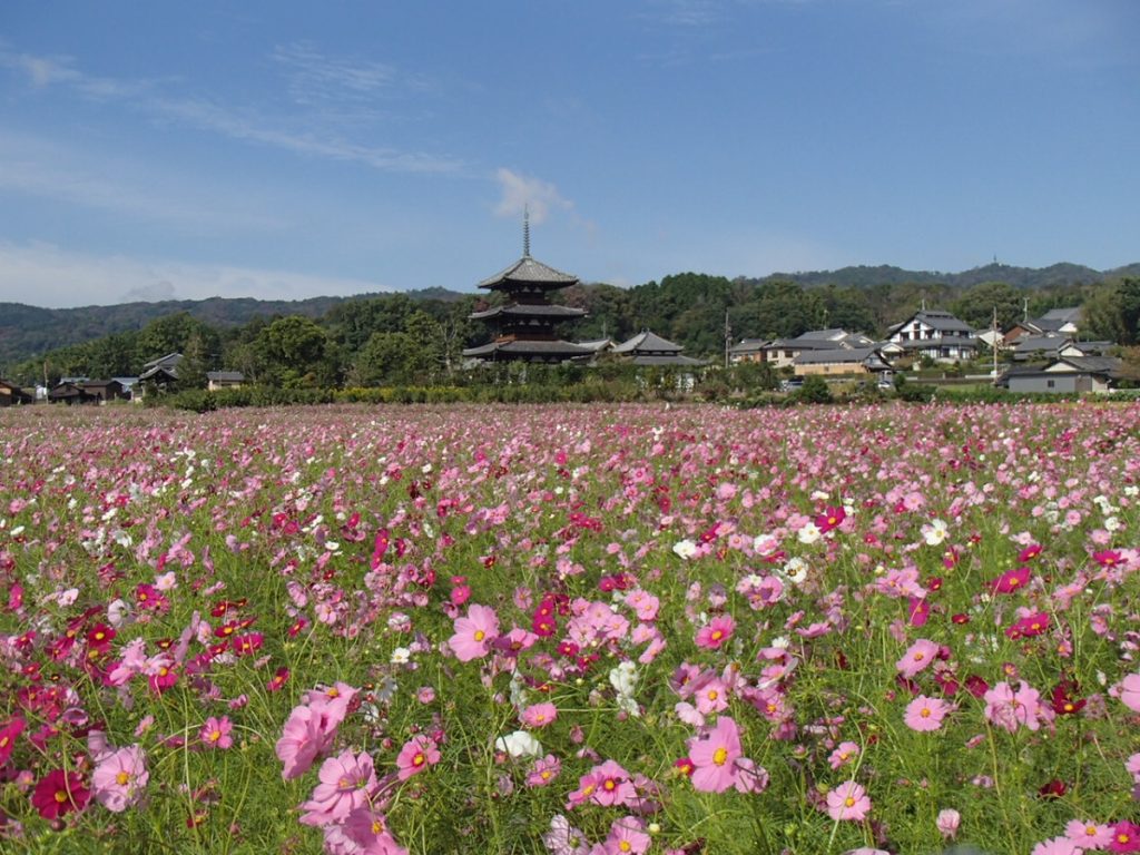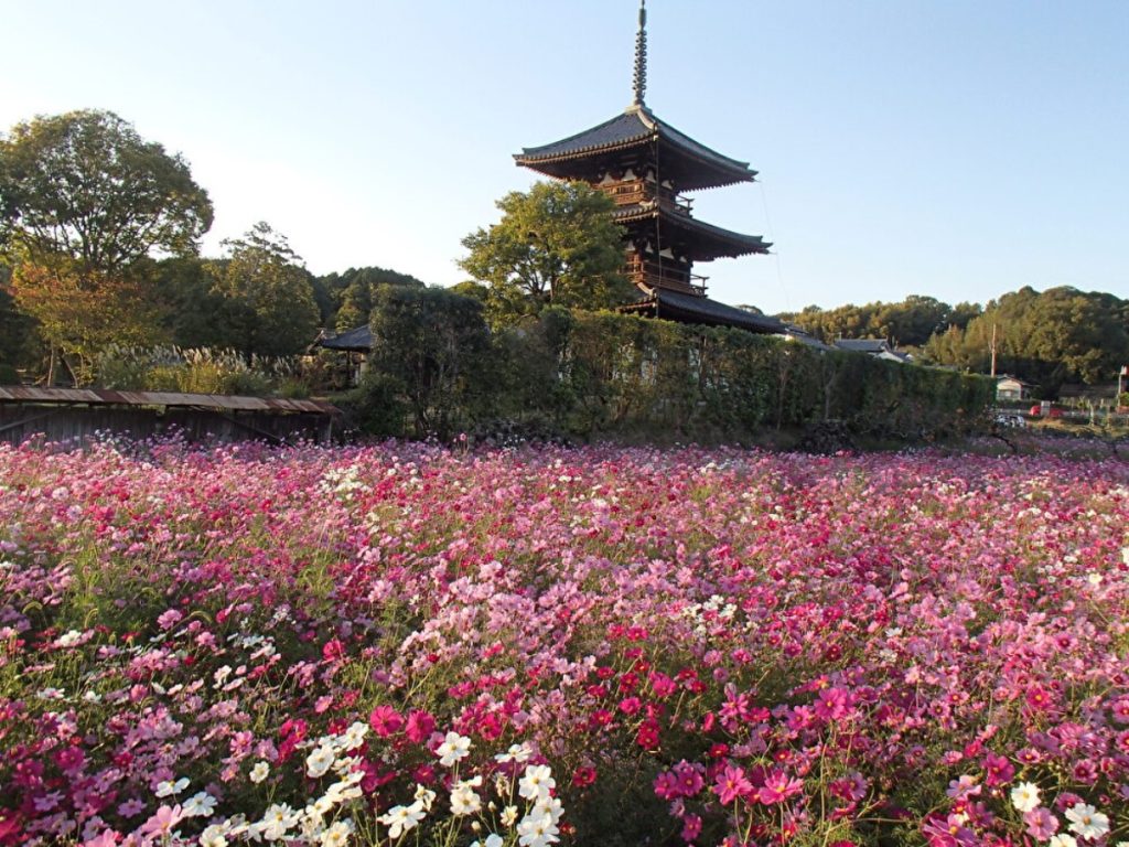 【奈良の秋の花2023】斑鳩の秋の風物詩!歴史的遺産と可憐なコスモスの共演|斑鳩町