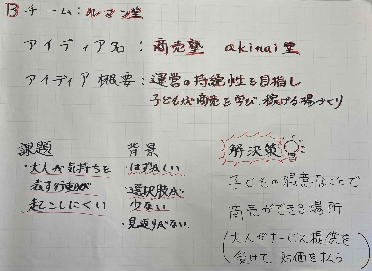 アイデア概要:運営の持続性を目指し、子どもが商売を学び、稼げる場づくり