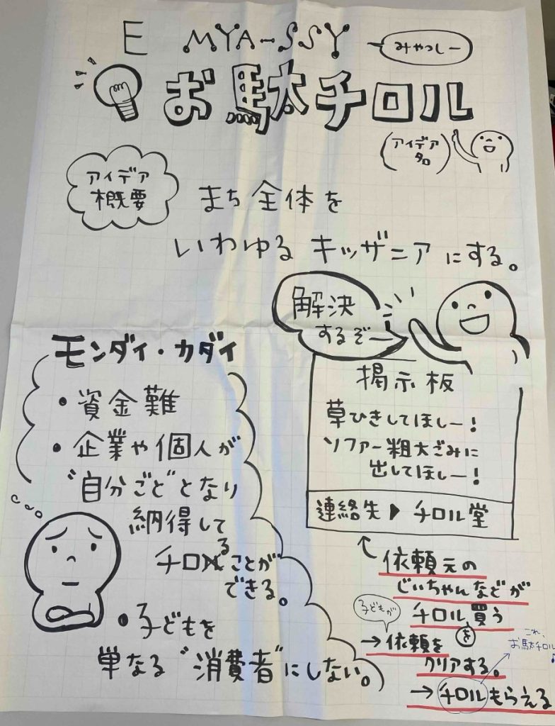 課題は、子どもを支える場所を提供する事業者等の資金難。これは、子どもが単なる消費者になっているビジネスモデルや、寄付する企業や個人の納得性を得られておらず、持続可能性な体制なっていないことなどが理由に挙げられます。今回は、まち全体をキッザニアにする施策を提案。例えば、人が集まる場所に掲示板を設置し、やってもらいたいことを書き出す。(草引き、粗大ごみの処分など) 子どもがミッションを実行し、依頼者は実行の対価としてチロル(お駄チロル)を渡す。ポイントは、子どもは単なる消費者ではなく生産者となることや、コミュニティが広がることで、企業や団体と子どもたちのつながりが生まれる点です。