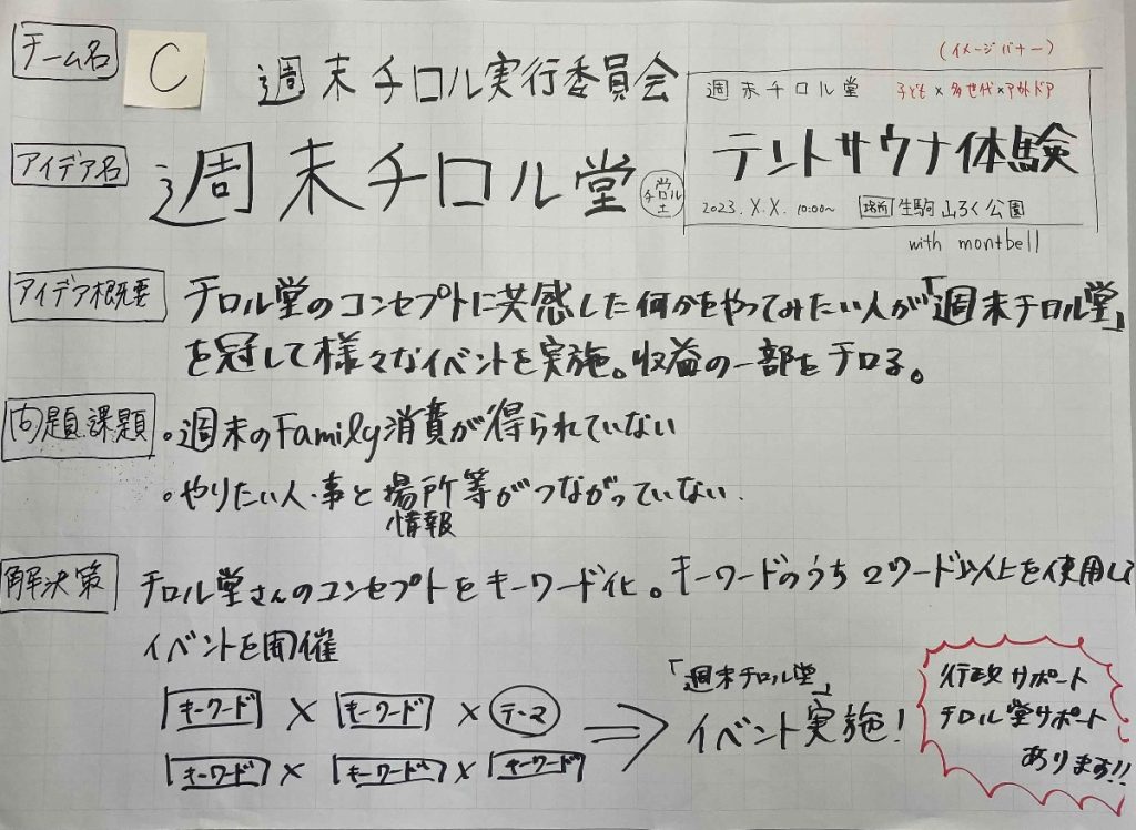 生駒市の課題として、市内で週末のファミリー層の消費が得られていないことや、やりたい人・ことと場所がつながっていないことが挙げられます。これらを解決すべく、チロル堂のコンセプトをキーワード化し、2つ以上掛け合わせて地域内でイベントを開催。例えば、「子ども」×「多世代」×「アウトドア」で、テントサウナ体験会を生駒山麓公園で実施するなど。また、共同提案制度を利用して、行政に提案しても良いのでは、という意見もありました。