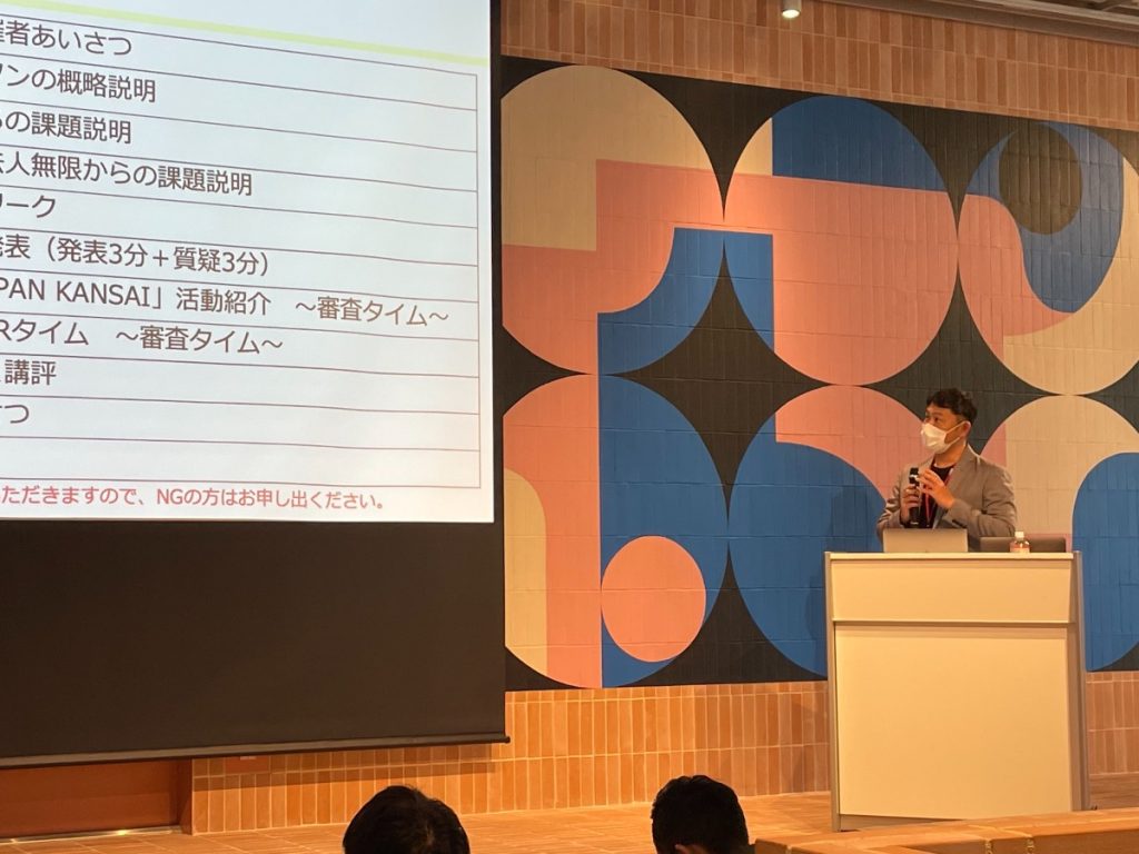進行は協創パートナーの「ONE JAPAN KANSAI」。「アイデアソンとは何?」、「アイデアソンはどのようにするの?」など、アイデアソンを行う上でのルールやタイムスケジュールについての話がありました。