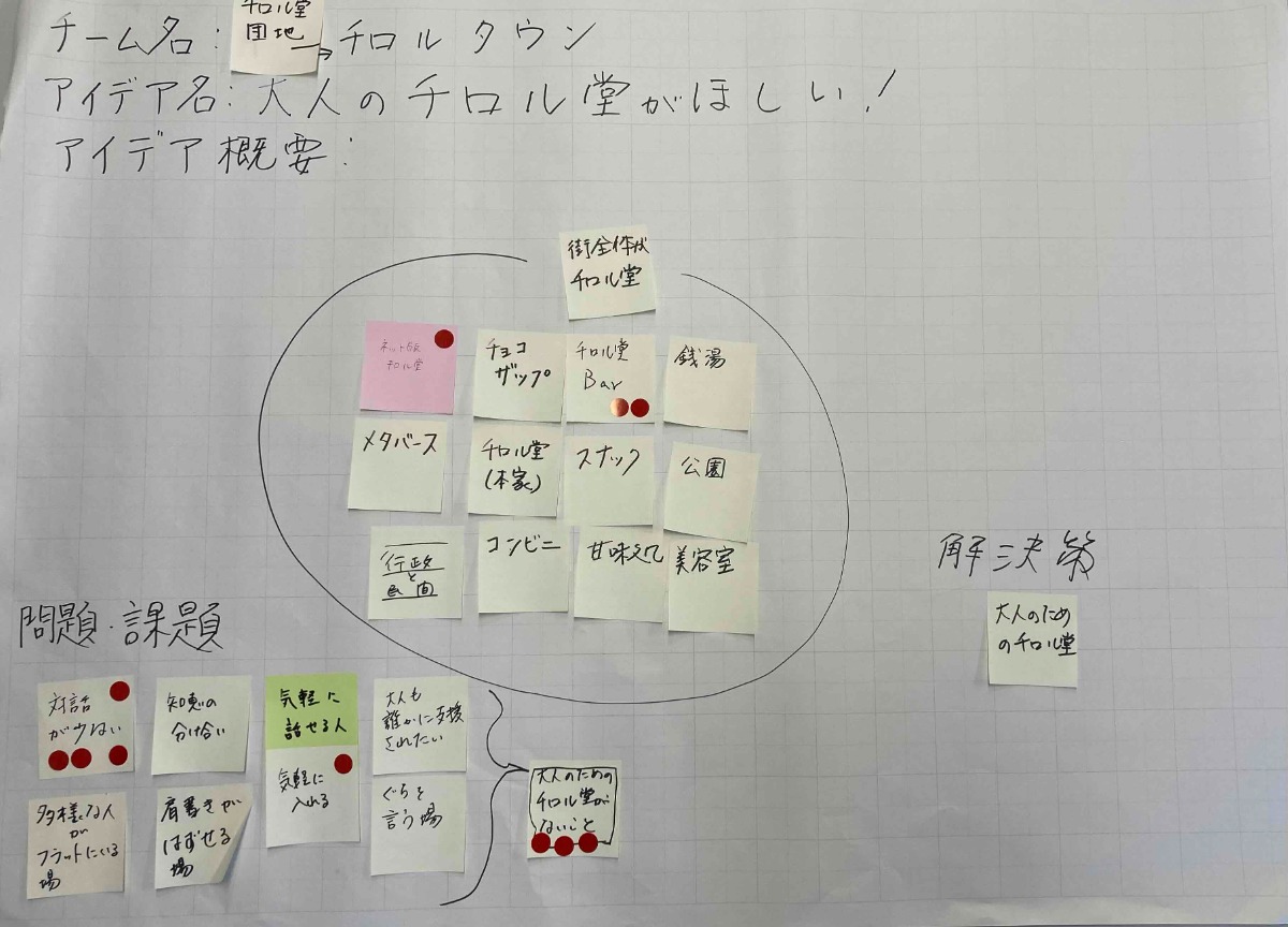 大人同士の対話機会があまりなく、「困りごと」を聞いてもらう場所が少ないことがまちの課題。それらを解決するために、大人のチロル堂を設立する。例えば、バー、銭湯、スナック、コンビニ、美容室、メタバースなどの場所を用いて、まち全体をチロル堂に。最初は団地などの小さなコミュニティから始め、その後まち全体に広げていく。ポイントは、”大人が変わらないと結局変わらない”という社会構造の課題を解決すべく、まずは大人たちが行動変容していこうという点です。