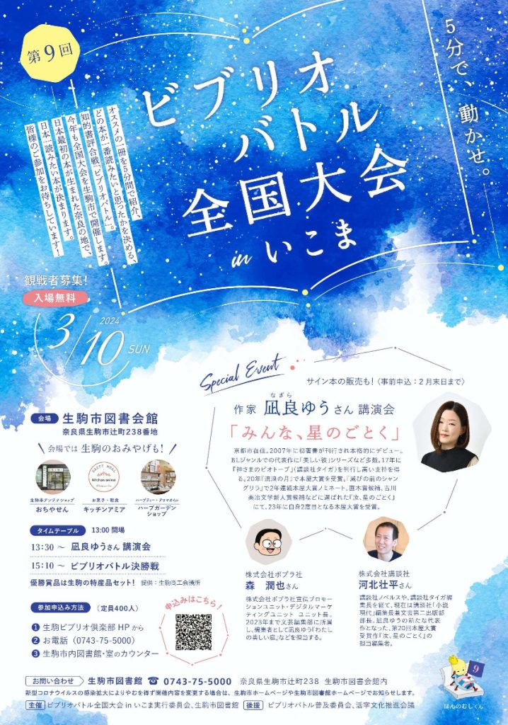 TOPイベント【奈良県生駒市】スペシャルゲストは本屋大賞作家の「凪良ゆうさん」 「第9回ビブリオバトル全国大会inいこま」を開催