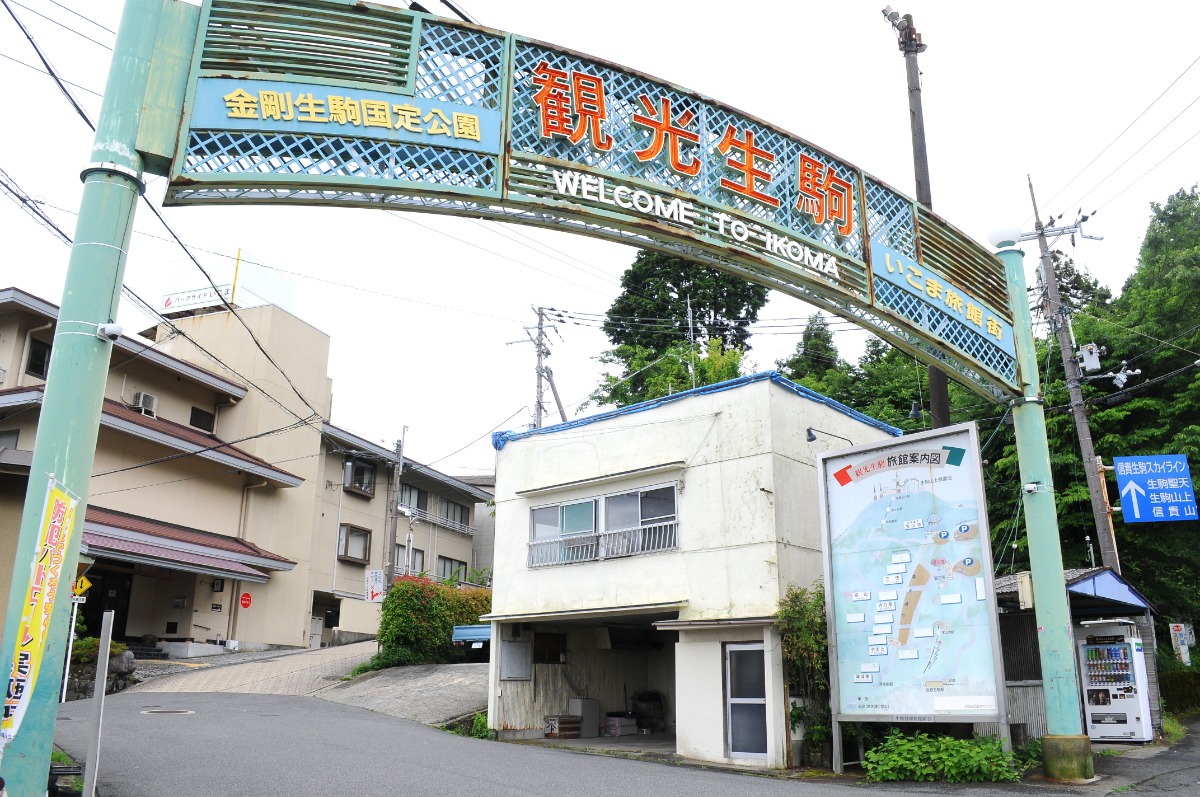 宝山寺の駅から生駒山中腹からの景色を眺めながら歩くと、歴史を感じる旅館街のゲートが見えてくる。