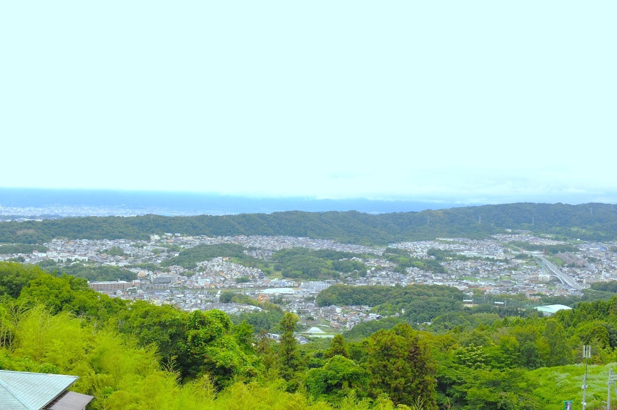 取材日はあいにくの曇天模様だったが、眼下に広がる奈良盆地の稜線が雨雲と曖昧な色合いで溶け合う風景を眺めるのもまた一興。