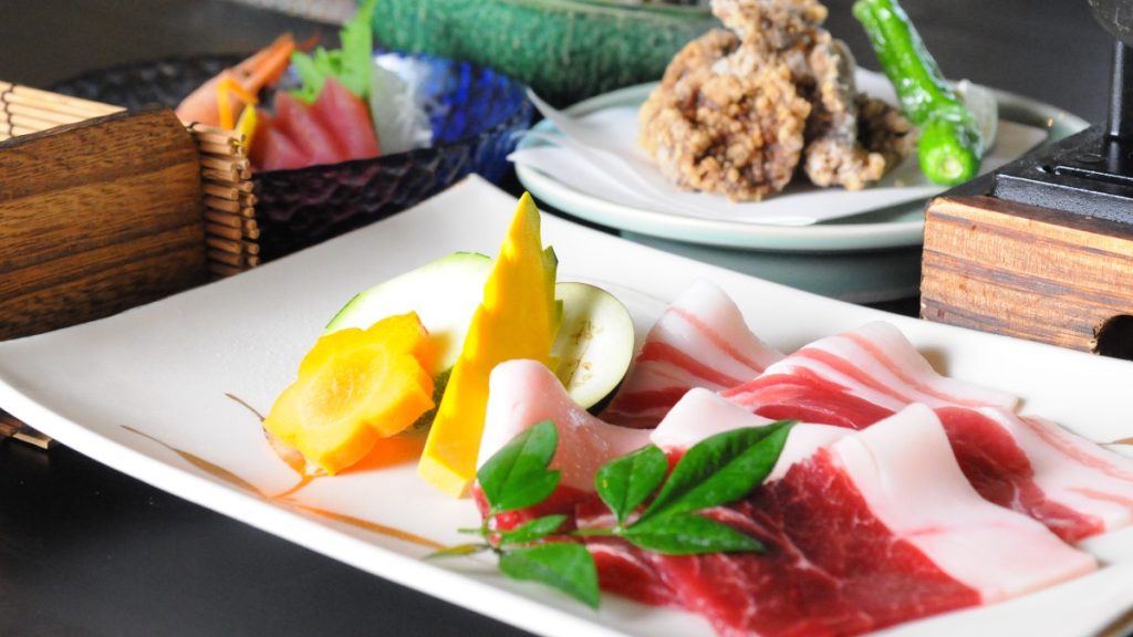 丹波篠山の猪肉を使った焼肉、そして奈良県川上村の鹿肉の竜田揚が楽しめるボリューム満点のジビエコース。