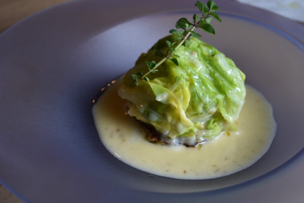キャベツの中に舌平目を包み込んだ一皿だ。