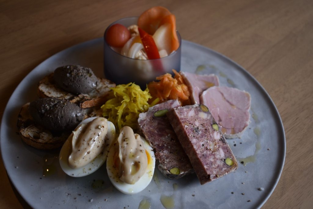 お皿奥から時計回りに、自家製ピクルス、ヤマトポークのジャンボン・ブラン、パテ・ド・カンパーニュ、ウフマヨ、レバパテ、お皿中央がキャロットラぺとサラダシュークルート。