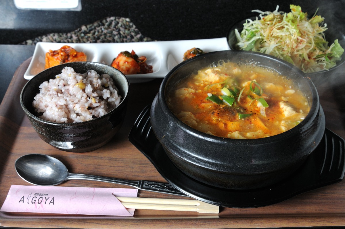 “純豆腐”とは、日本でもよく耳にする「スンドゥブ」のこと。 とてもやわらかい豆腐のことで、韓国ではポピュラーな食事メニュー。 こちらのセットには、スンドゥブと五穀米、前菜、サラダが付いてくる。
