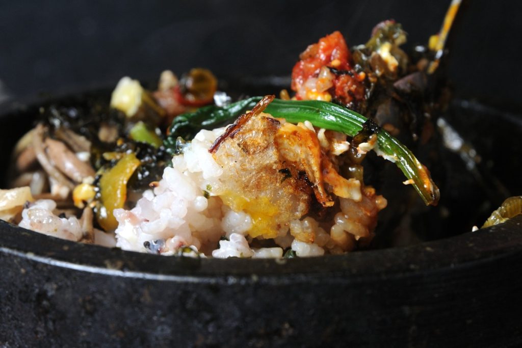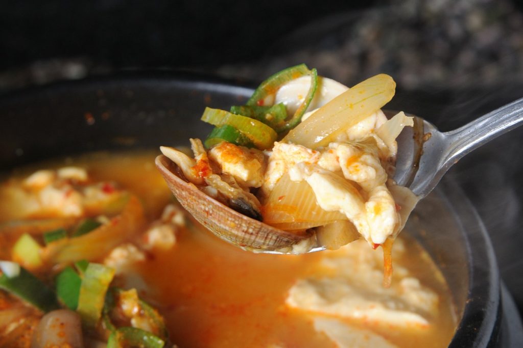 “純豆腐”とは、日本でもよく耳にする「スンドゥブ」のこと。 とてもやわらかい豆腐のことで、韓国ではポピュラーな食事メニュー。 こちらのセットには、スンドゥブと五穀米、前菜、サラダが付いてくる。